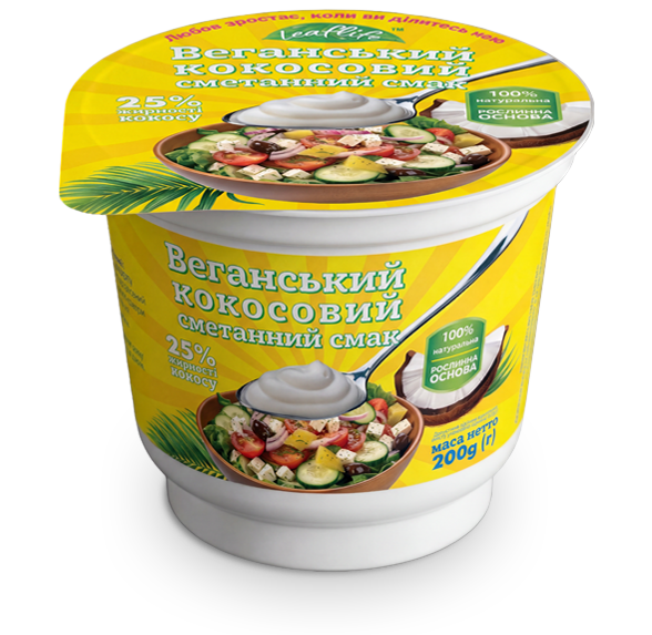 Цей продукт  — це ніжна рослинна альтернатива традиційній сметані, створена на основі натурального кокосового молока. На 100% рослинній основі й завдяки 25% кокосової жирності він має приємну кремову текстуру та делікатний смак, який чудово поєднується з будь-якими стравами, від салатів до десертів.